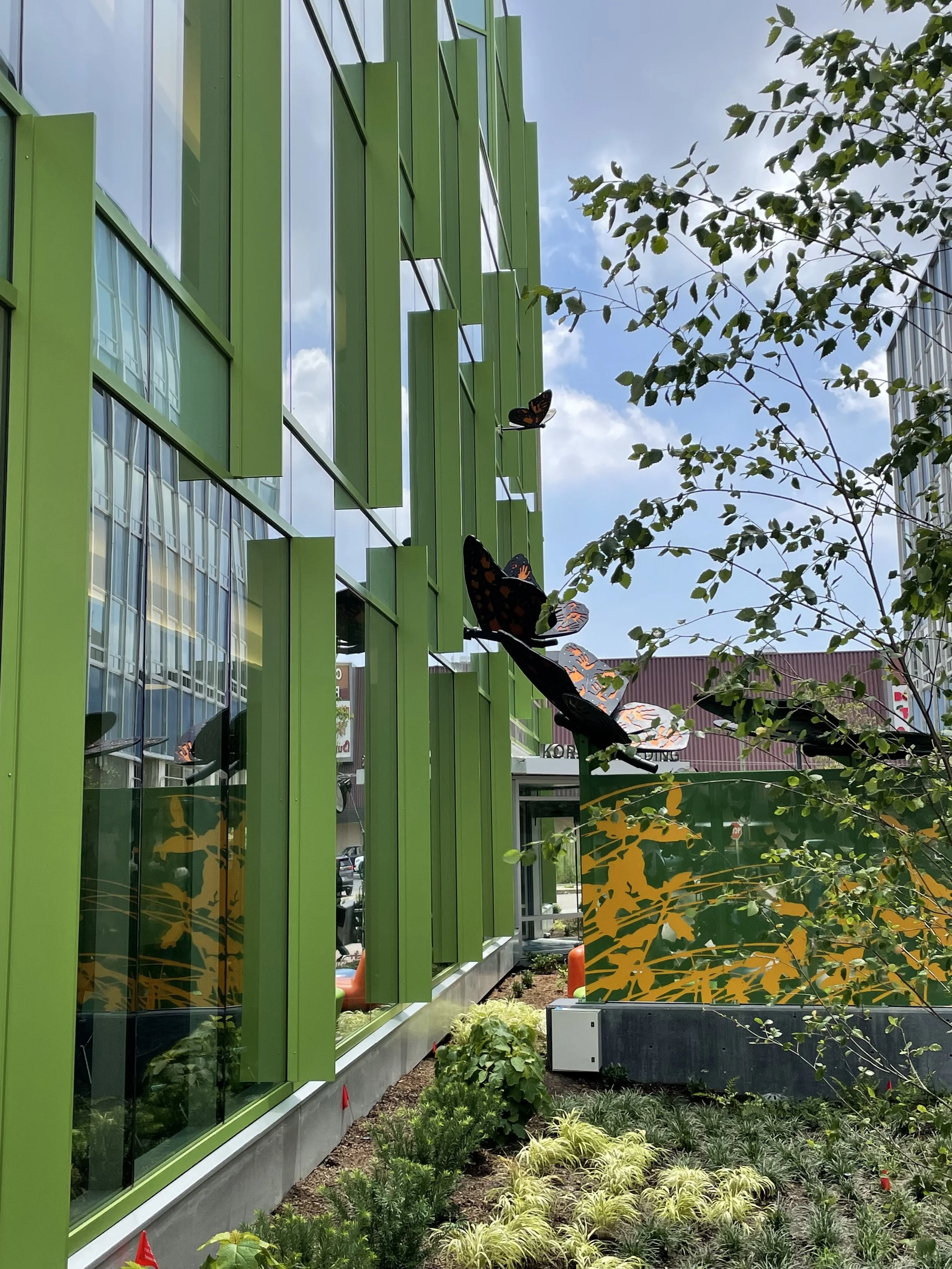 The parking lot includes a rain garden with native plants to collect, clean, and manage stormwater. From the parking lot, visitors enter into the garden space which knits together the two buildings, while providing separate places for each group to use. The center focus is a sculptural feature wall by artist Kate Kaman. Ground Reconsidered worked with the artist to use the wall as a visible separation of the two building spaces, while still providing a sense of connection. The adult side of the garden includes a table that can be used by groups. The children’s side includes fun, colorful seating that can be used for play or for breakout family discussions.