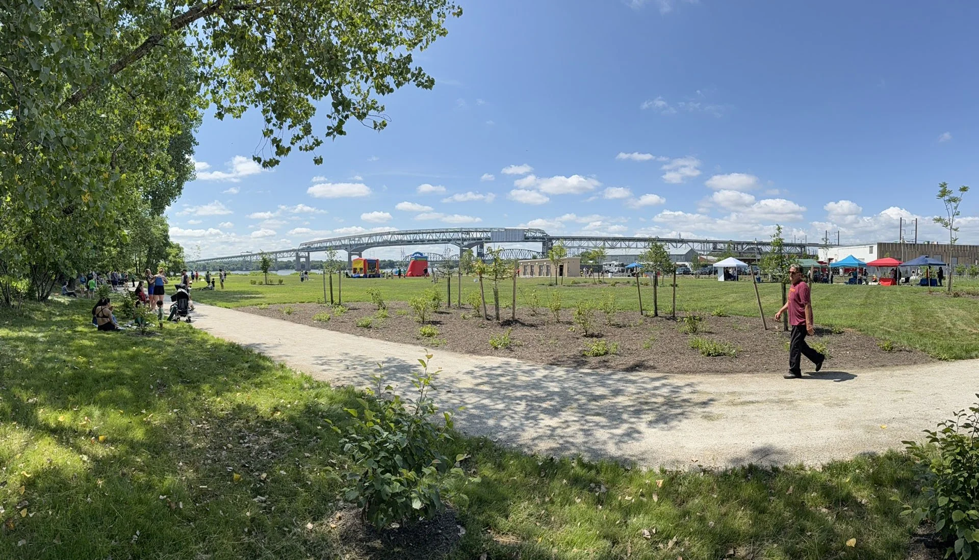 From the parking lot and trail head, visitors cross three bridges spanning a lush tiered rain garden, into the ‘lower park’ which includes a grand lawn, stage, amphitheater, public restrooms, covered picnic pavilion and a custom boardwalk extending over the riverbank focusing views to the Betsy Ross Bridge. The entire park has been regraded to provide universal access, while limiting cut/fill and avoiding disturbance of the contaminated soil. Imported soil will be installed over the existing pavement in the ‘lower park’. Diverse plant communities are planned including a gravel garden, woodland restoration and creation, and riparian buffer in the ‘lower park’. The ‘upper park’ is ringed with a woodland with a large central meadow and path network. Riverfront North Partnership and Philadelphia Parks & Recreation have worked to eliminate invasive plants on site and the proposed plant palette will be composed entirely of native species.