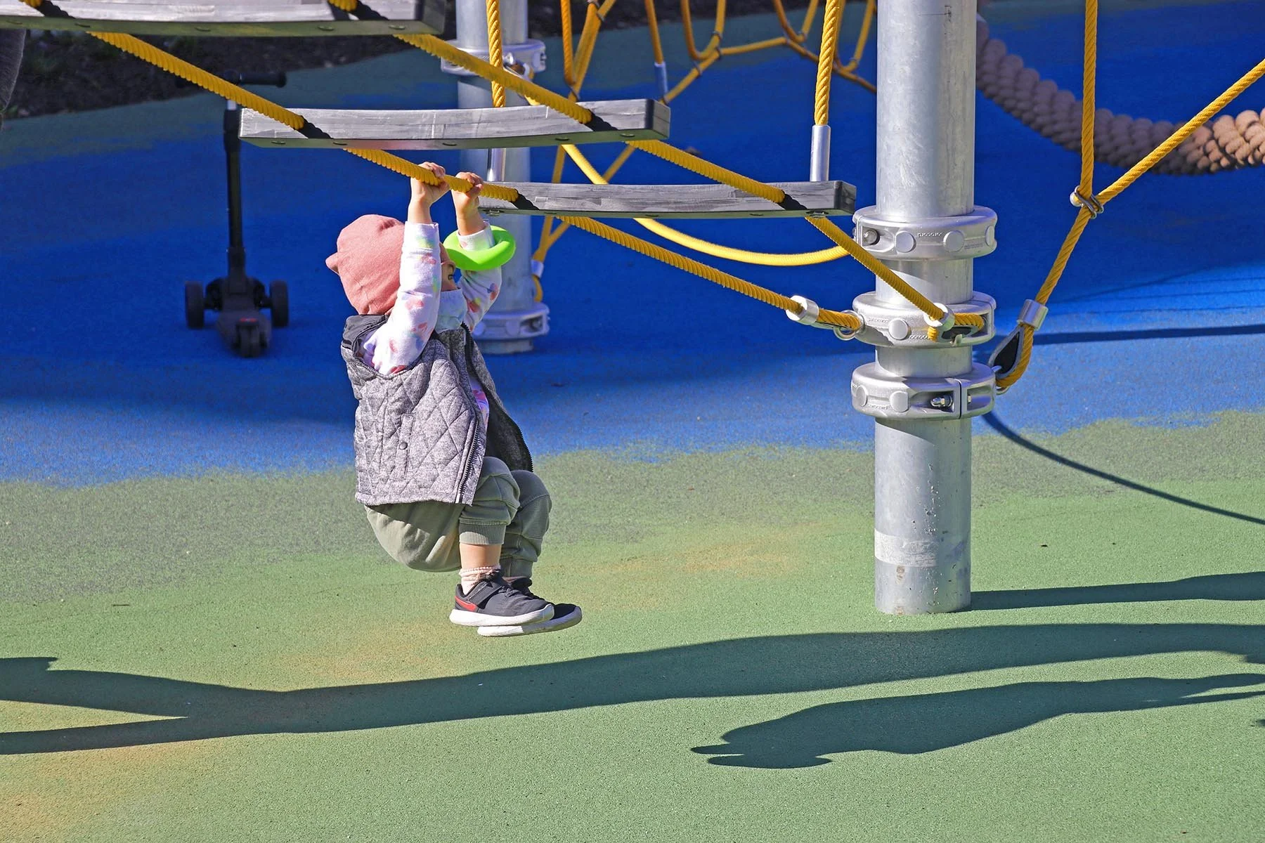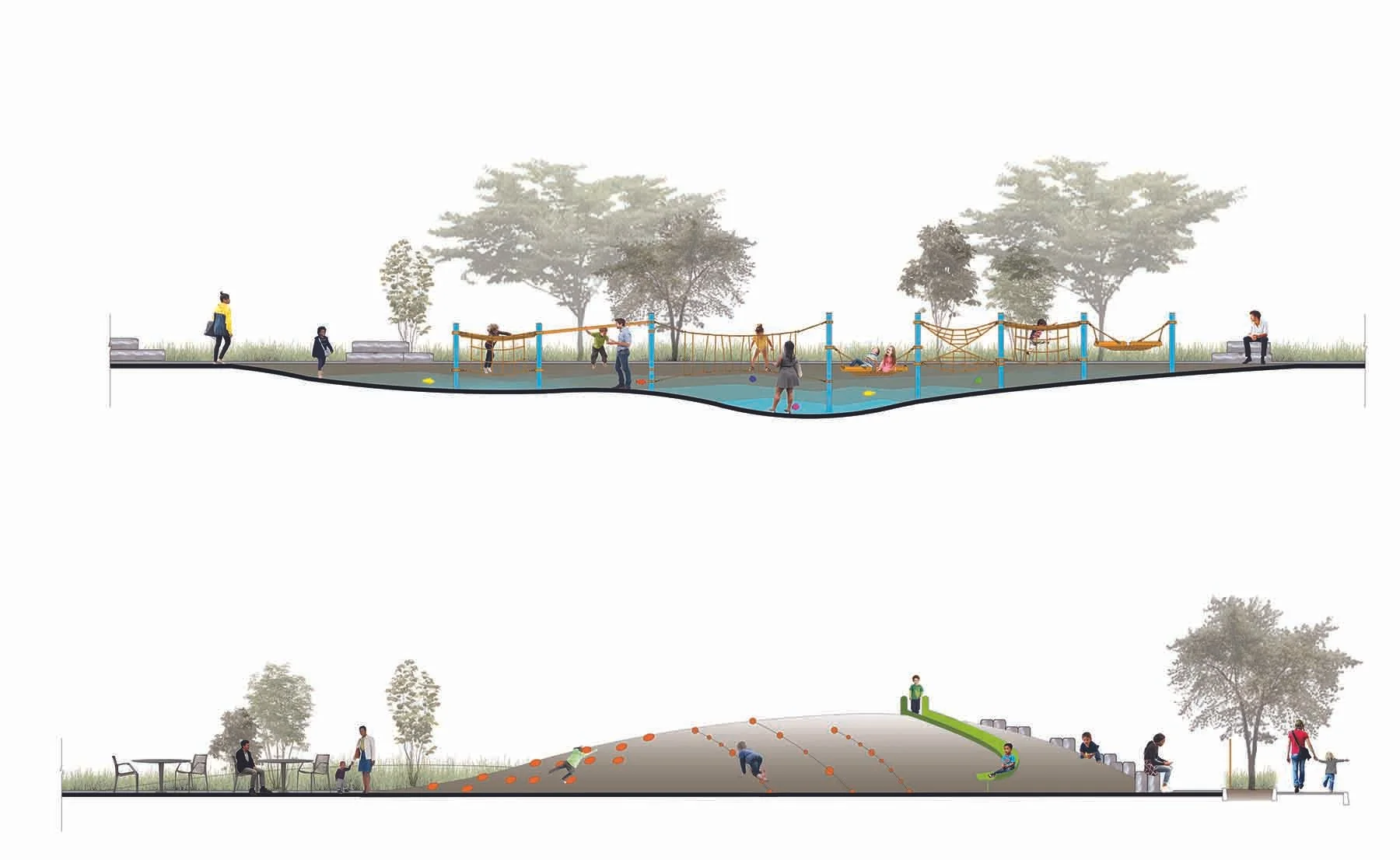 The playground includes equipment for children from 2-12 years of age including a climber, hammock swing, and small wooden boat, as well as trees and hardy colorful plantings. The dog park includes small and large dog areas with turf and foundations. A grassy mound with accent benches and boulders serves as an expansion green barrier between the playground and the Benjamin Franklin Parkway. The greenway is a popular space for local families and visitors to attractions in the area.