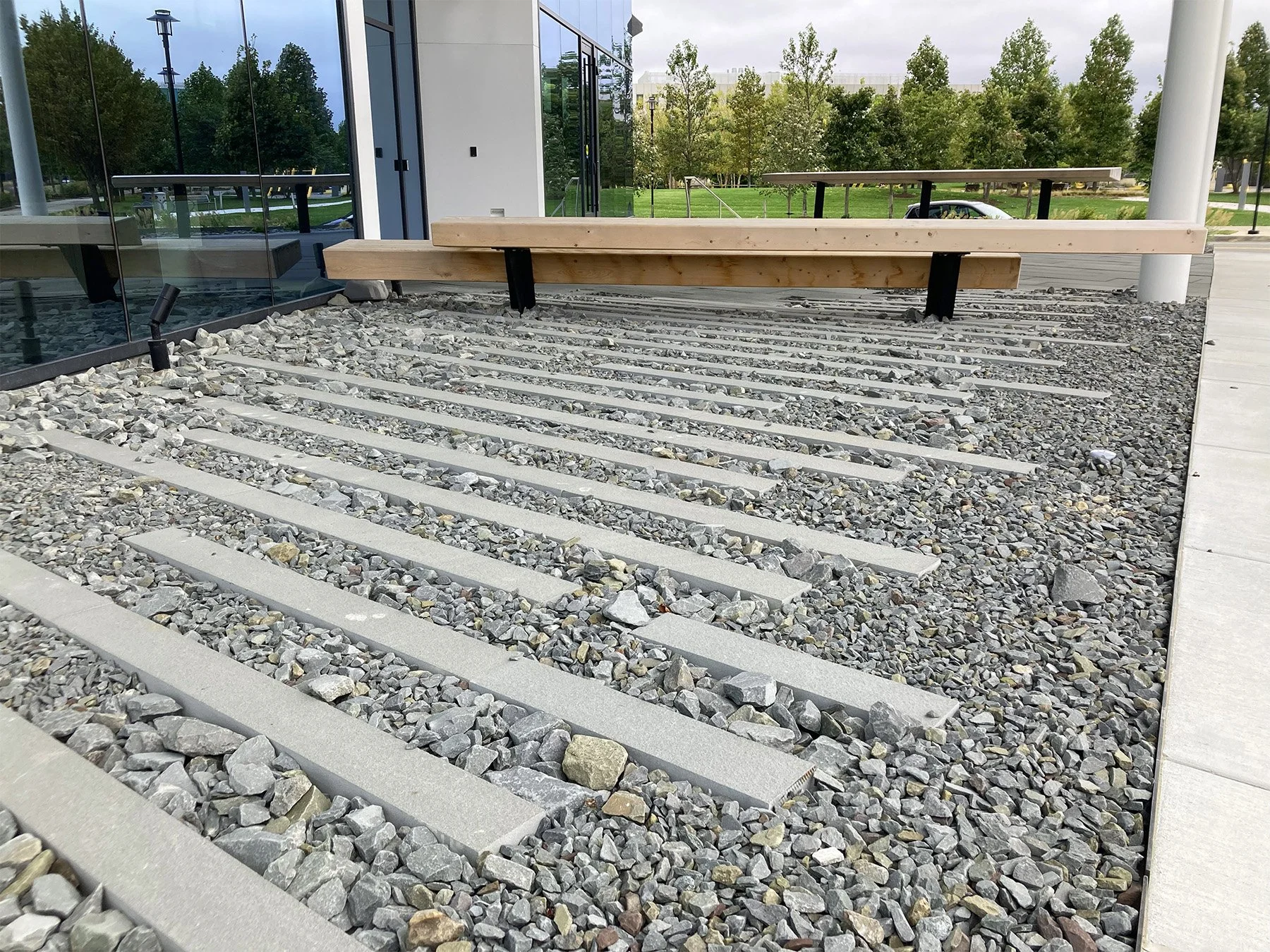 The Iovance Biotherapeutics at 300 Rouse Boulevard landscape design is informed by two primary aspirations: expressing innovation through material use and developing a geometric dialogue between the landscape and the building. The project is the most recent addition to the transformation of the Philadelphia Navy Yard from a military and industrial complex into a modern, thriving business, manufacturing and soon to be residential community. Building on the long history of innovation at the Navy Yard, the selection composition and detail of materials builds on the long history of innovation at the Navy Yard. Our work included the design of a performative stormwater retention entry courtyard, a public terrace, streetscape along 11th Street, Normandy Place and Rouse Boulevard and related surrounding site elements.