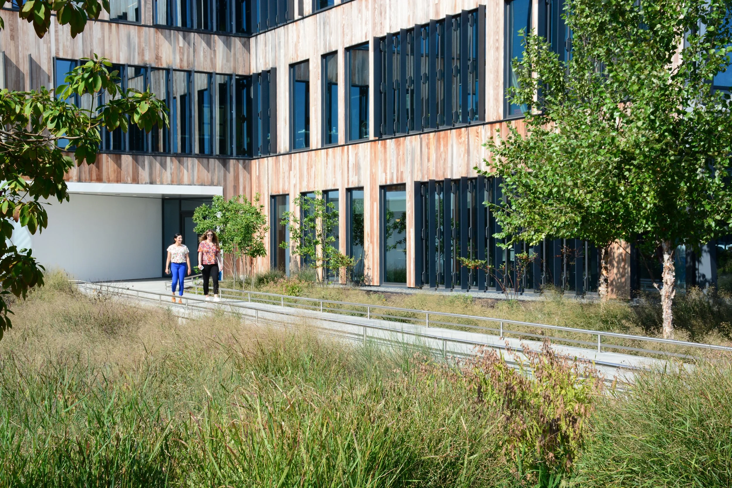 A modular bridge connects through the stormwater courtyard to the building entry, meeting water management requirements while leveraging plantings to define a lush - and educational - arrival experience.