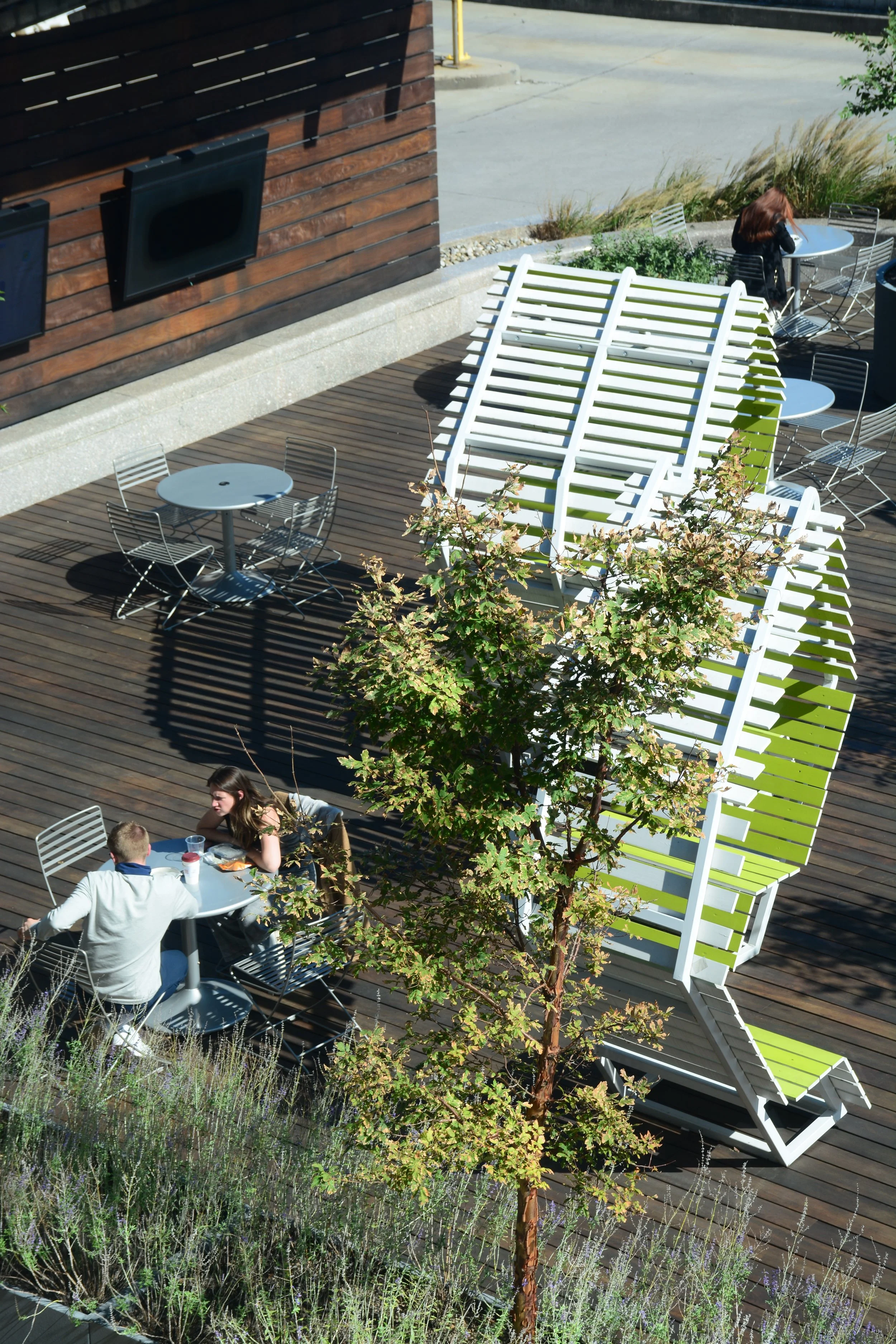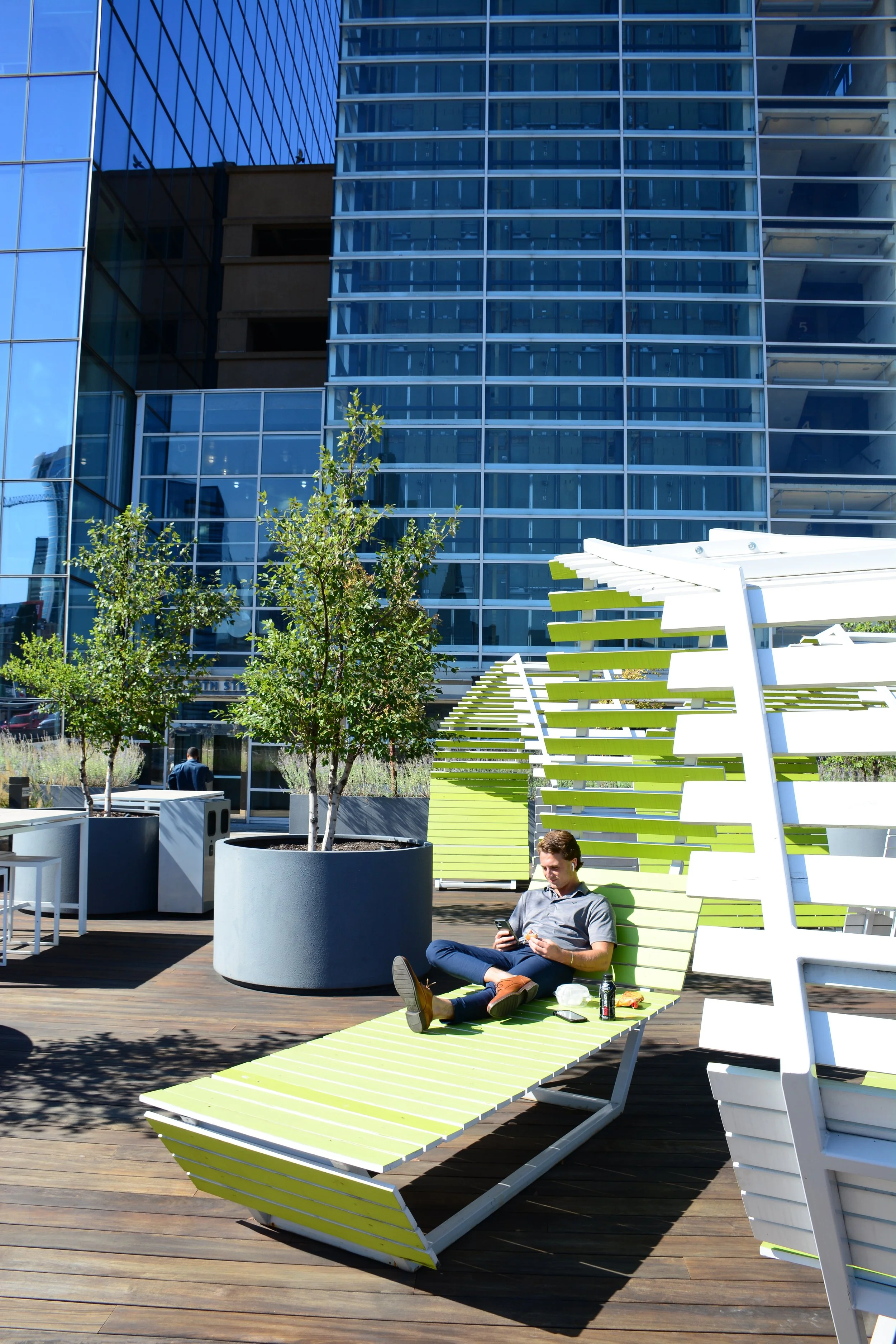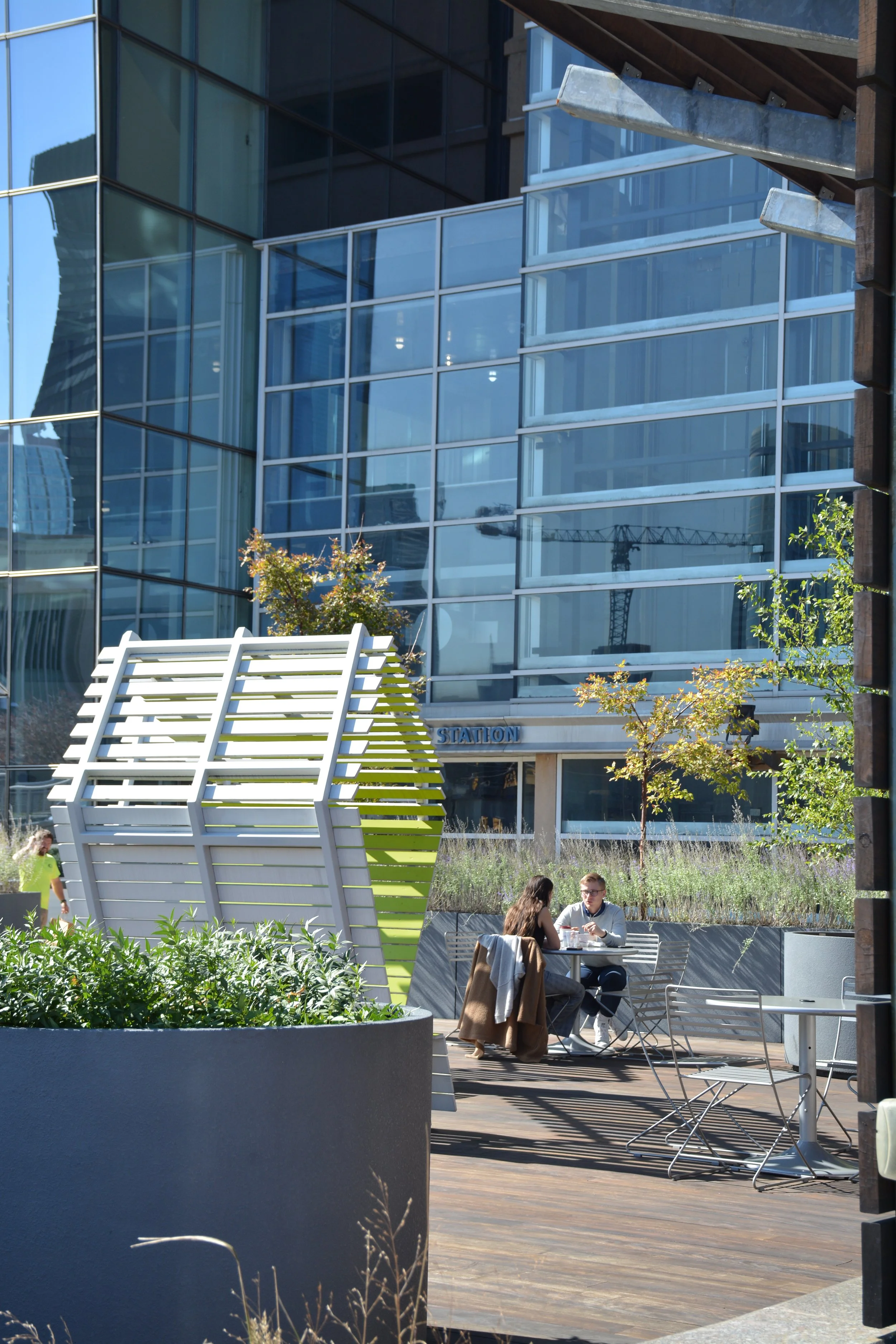 Previously used as a smoking outpost, the plaza adjacent to the front entrance of the Cira Centre was ripe for improvement. Our intervention transformed this sparse concrete plaza into a warm, inviting terrace. A wood deck was installed over the concrete structural slab (the plaza is over a garage), a custom designed screen wall/trellis mitigates the prevailing winds and views of the adjacent garage entrance as well as supports several large video screens. Modern work tables, stools and power pedestals were positioned in combination with custom built bench structures and loose tables and chairs throughout the plaza. A carefully curated selection of plants were installed in new large planters as well as in the pre-existing perimeter planters. The plaza is now a well-scaled and comfortably furnished place where the building tenants can work, enjoy lunch or recline during a break.