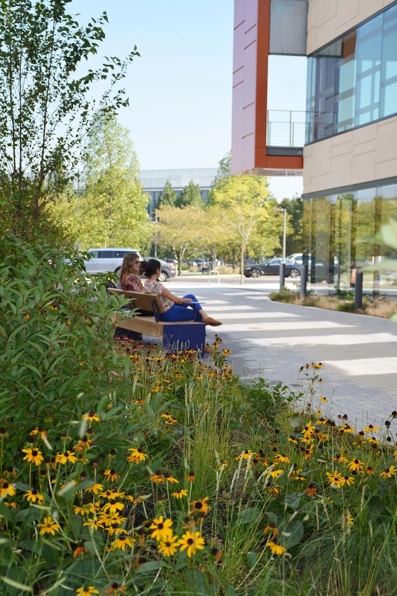 The project lays the groundwork for the necessities and amenities needed to fulfill the ‘Live, Make, Play’ model that have been deemed essential to the continued success and evolution of the Philadelphia Navy Yard. It is a space of linear movement and circulation, but by design, includes pockets for one to wander, pause, and enjoy a quiet moment surrounded by a generous and largely native planted landscape. The “Front Porch,” optimally located adjacent to ground floor retail, acts as a social hub, offering seating opportunities and encourages the community to gather. In short, the Pedestrian Connector, while designed as a shared use space, does what successful urban neighborhoods do; it makes a commitment to the pedestrian experience first and foremost.